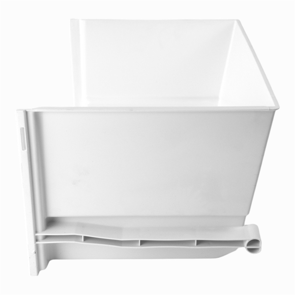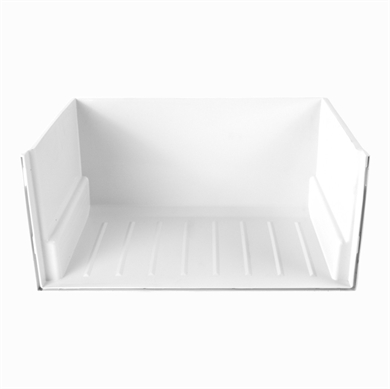 - Hvid grøntsagsskuffe uden front til køleskab.
