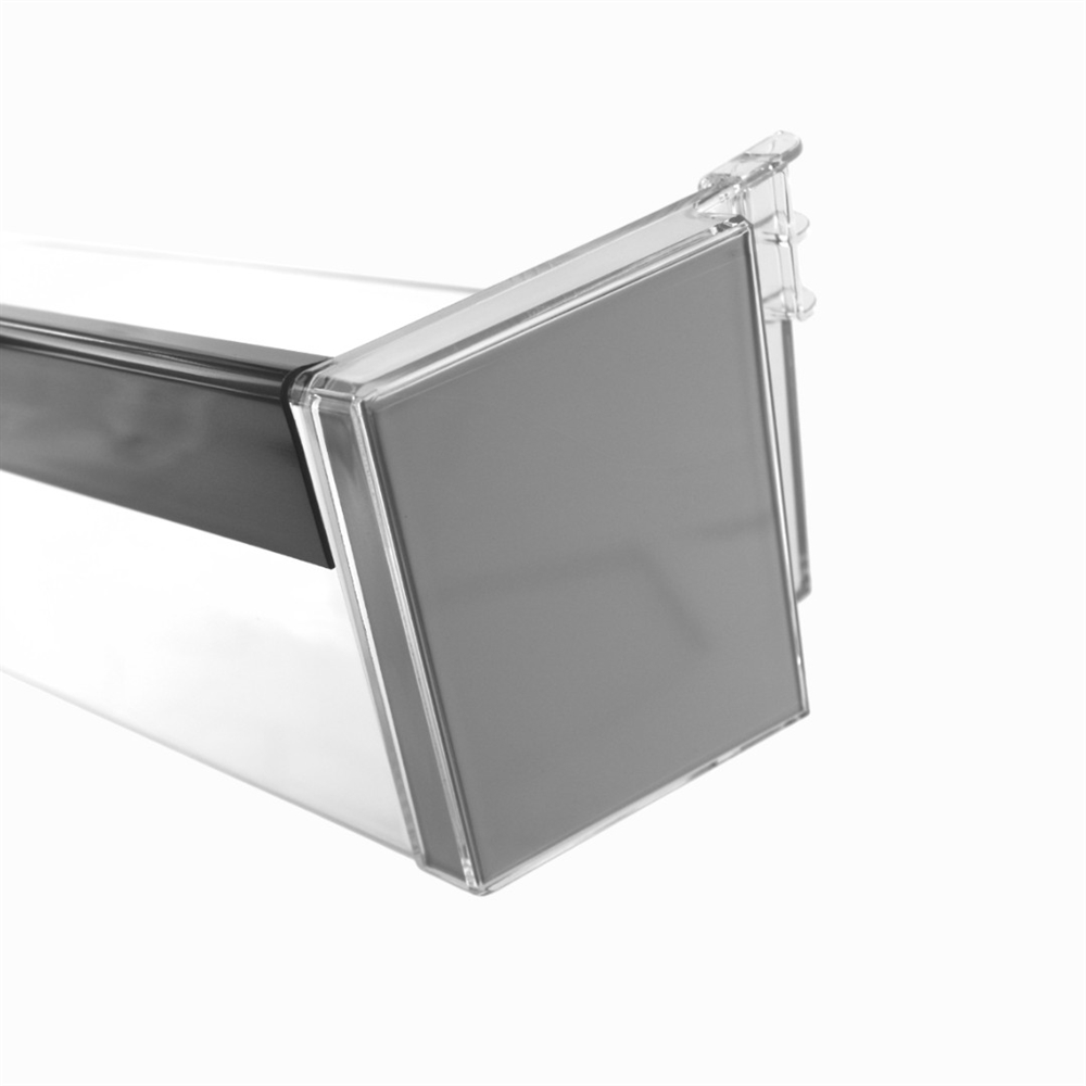 - Klar plast med mørk kant på forside.