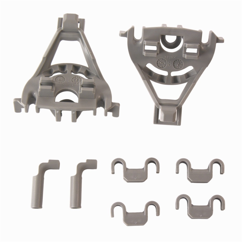 Montagesæt til tallerkenrække med vippebeslag til SIEMENS og BOSCH opvaskemaskiner. Sættet består af 8 dele i grå plast. 6 små holdere og to store til placering af vinkel på tallerkenrækken.